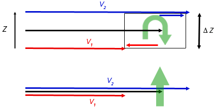 2. Het verschil met de gemiddelde windvector (zwart) wordt aangegeven met de kleine rode en blauwe pijltjes, die respectievelijk aan de onderkant naar links wijzen en aan de bovenkant naar rechts. De richting van de rotatie wordt aangegeven door de dikke, groene pijl. Zie figuur 5 op de volgende pagina. De vorticiteit als differentiële verandering in de windvectoren is op zichzelf ook weer een vector, waarvan de kracht wordt bepaald door de verticale snelheidsgradiënten en de richting door de gemiddelde rotatieas.