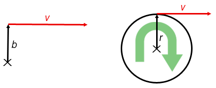 Het impulsmoment van een deeltje, dat op een afstand b met een snelheid v voortbeweegt, is nu gelijk aan dat van een deeltje met gelijke massa dat ronddraait met de snelheid v in een cirkel met radius r = b. Zie figuur 4 voor een illustratieve weergave.