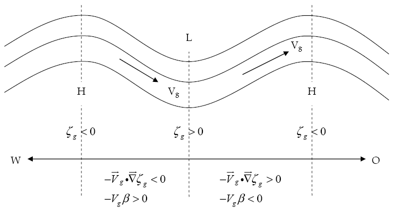 De eerste term aan de rechterkant is proportioneel aan de advectie van absolute vorticiteit. Voor verstoringen in de westelijke stromingen, is de advectie van relatieve vorticiteit en planetaire vorticiteit tegengesteld aan elkaar. De advectie van relatieve vorticiteit heeft de neiging om de verstoring naar het oosten te verplaatsen, terwijl de advectie van planetaire vorticiteit juist de neiging heeft om de verstoring naar het westen te verplaatsen. Voor kortere golven, met een golflengte van minder dan circa 3000 kilometer, domineert de advectie van relatieve vorticiteit, terwijl voor grootschaligere verstoringen juist de planetaire vorticiteit domineert. In onderstaand figuur is een golfvormige verstoring getekend met daarin de verdeling van vorticiteit en vorticiteitsadvectie: