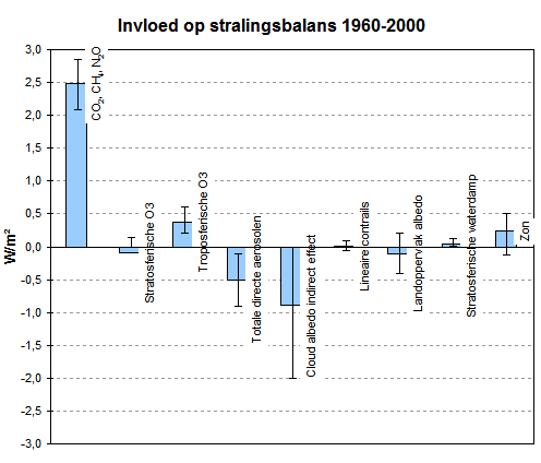Over de afgelopen 40 à 50 jaar is de hoeveelheid inkomende straling toegenomen met zo'n 1,6 W/m². Dit is in feite het netto resultaat van diverse factoren ('forceringen', ofwel directe invloeden, en terugkoppelingen, ofwel min of meer gevolgen van) die zowel positief als negatief de stralingsbalans beïnvloeden. De belangrijkste factoren en hun corresponderende invloed op de verandering in de stralingsbalans in W/m² zijn in onderstaande boxplot weergegeven. De grote staven geven de meest waarschijnlijke invloed op de verandering weer en de dunne staafjes met de uiteinden het bereik van de onzekerheid in de schattingen en/of metingen.