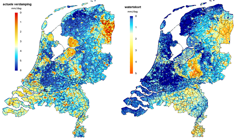 Watertekorten zijn vooral onstaan in Oost Drente en Oost Groningen, in de Veluwe en in Zuid Limburg. In Brabant en de Utrechtse Heuvelrug is de situatie minder ernstig maar zorgelijk, mede doordat er weinig neerslag wordt voorspeld. Weide gebieden in Friesland en het Groene Hart lijden niet onder de huidige klimatologische omstandigheden. De jonge gewassen in de akkerbouwgebieden in Groningen, Flevoland, Zeeland en de Wieringermeer kennen geen watertekort maar het vochtgehalte in de bodem is laag. Ze bevinden zich daardoor op een kritisch punt.