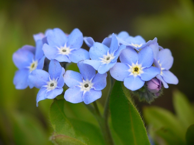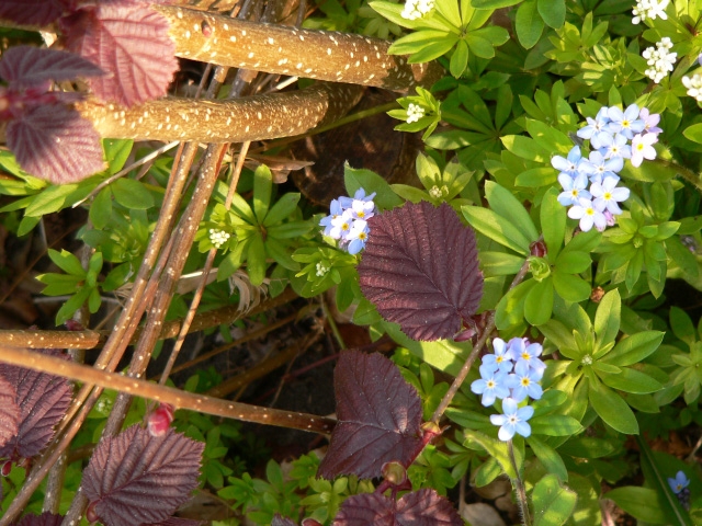 De vergeet-me-nietjes, de lievevrouwebedstro (staat op het punt te gaan bloeien, op de foto is alleen het blad duidelijk zichtbaar) en de rode hazelaar vormen elk jaar een mooie combinatie.