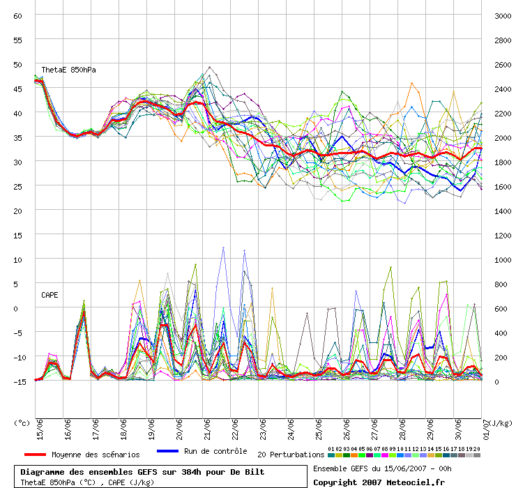 De GFS00 Oper laat een onweersstoring passeren op woensdag en het GFS00 ensemble komt dan dus ook weer met een thetaE850-piekje (warme sector).