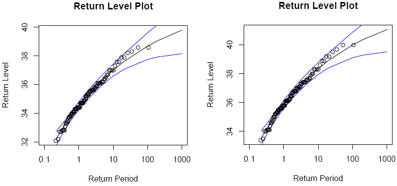 [2], [3], de fit was in het geval van deze reeks beter dan ook wel frequent gebruikte GPD-fit. Met behulp van deze fit is de herhalingstijd voor het grootste extreem vastgesteld op ~100 jaar, met een 95% waarschijnlijkheidsmaximum voor die herhalingstijd van 40,1°C.