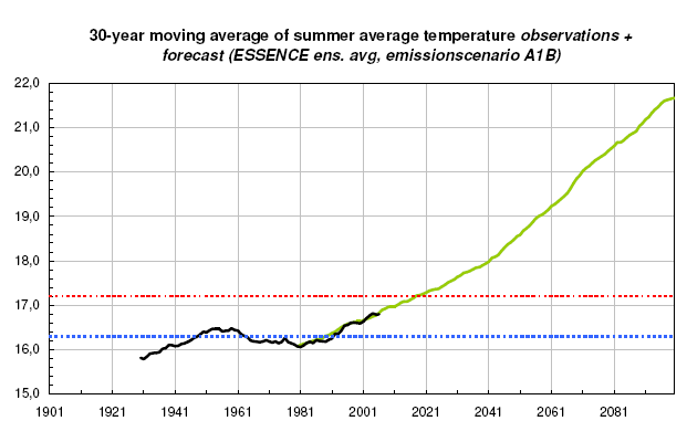 ESSENCE project. De gehanteerde prognose van het verloop van de zomertemperatuur voor 1950-2100 is feitelijk een ensemblegemiddelde van 17 modelruns uit het ESSENCE project, allemaal uitgaande van het emissiescenario A1B (zie