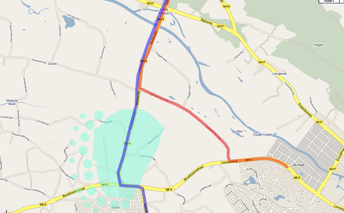 Rijd ik een krap 1 á 1,5 uurtje terug weer naar Doetinchem, ditmaal alleen met een kleine afwijking. In plaats van rode route terug te volgens na Keppel even de blauwe route gevolgd richting Kilder. Ik gewoon niets vermoedend rijden, kom ik plots van de een op de andere meter in een witte wereld voor Wehl terecht, op maar luttele 100 á 200 meter afstand van de eerder afgelegde rode route! Ongeloofelijk, bomen wit, daken wit, akkers wit!! Licht daar gewoon eventje een sneeuwdekje van 1 á 2 cm! Heb dit proberen te weergeven in blauwe vlek, circeltjes houden in dat ik niet weet tot hoever de "sneeuwvlek" doorloopt! In Wehl voor de rotonde ook nog sneeuw, ongelukje gebeurd bij kruising verderop, sla ik af richting Kilder, is het plots van een op andere meter weer groen! Ongelofelijk bizare verschillen op luttele meters afstand! Sneeuwvlek bedroeg niet meer dan 800 meter. Weet niet of deze zich nog in westelijke richting heeft uitgebreid.
