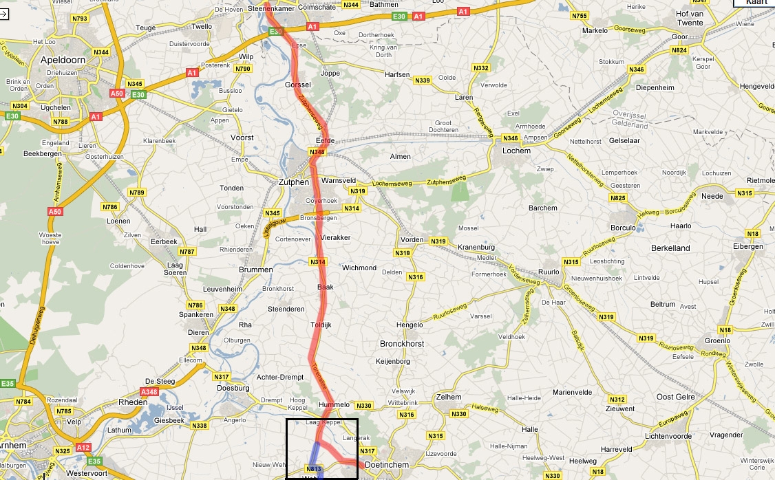 Ben beetje stomverbaasd na vanmorgen! Vanmorgen rond uurtje of 10 richting deventer gereden volgens de rode route die op onderstaande kaarten zichtbaar zijn (totaal route en uitsnede). Niks geen sneeuw gezien op die route, hooguit wat uitsneeuwende bomen door de dikke rijp afzetting wat overigens vaak er mooi uitzag! Ook meer naar Deventer geen sprake van poederdekje sneeuw ofzo, alleen maar wat rijp op akkers en bomen. In Deventer zelf kwam ik wel enkele auto's tegen met wat sneeuw op dak, geen idee waar dat van afkomstig geweest zal moeten zijn.