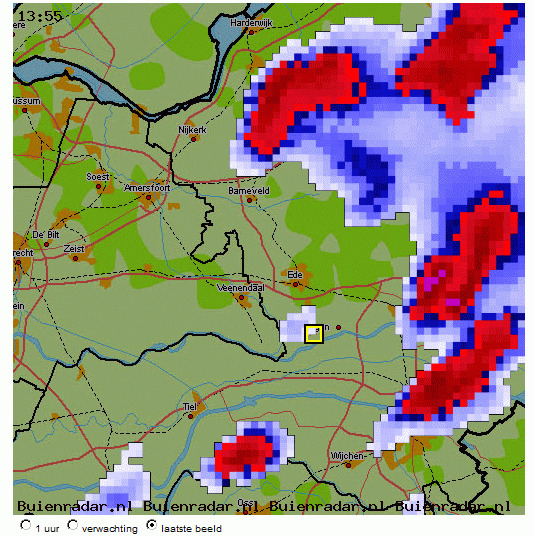 Lennart had ook al hagel gezien in Arnhem, en gezien de radarbeelden was het ook niet onlogisch. Mijn indruk is namelijk dat je bij zomerse convectie je wel aan zomerhagel mag gaan denken zodra je paarse pitten ziet op buienradar.