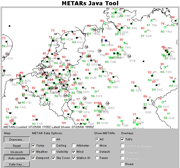 De kaart verspringt dan naar Europa. De rode cijfers geven de temperatuur volgens de METARs, de donkergroene het dauwpunt. (Helaas beide in °F, ik weet nog niet of en zoja, hoe je deze grootheden op de kaart in °C kunt plotten.)