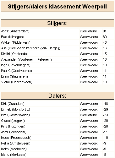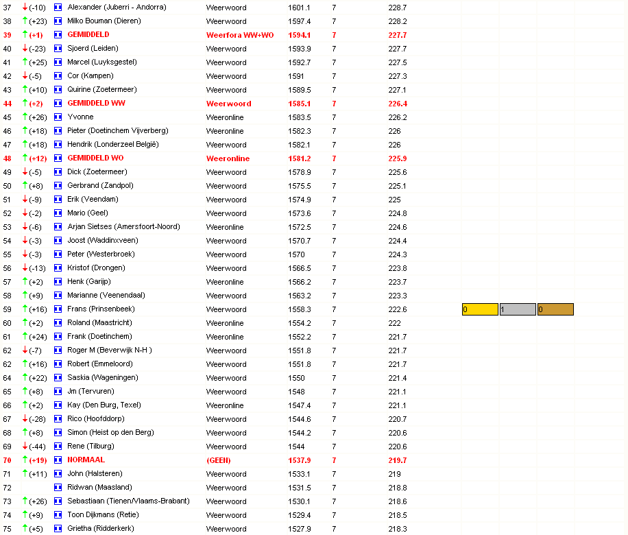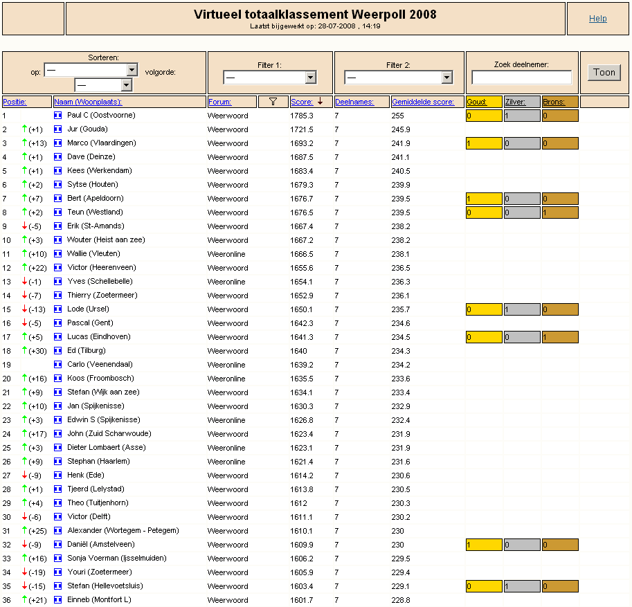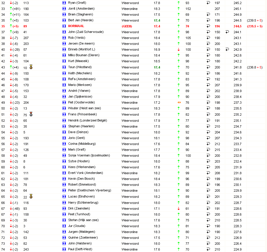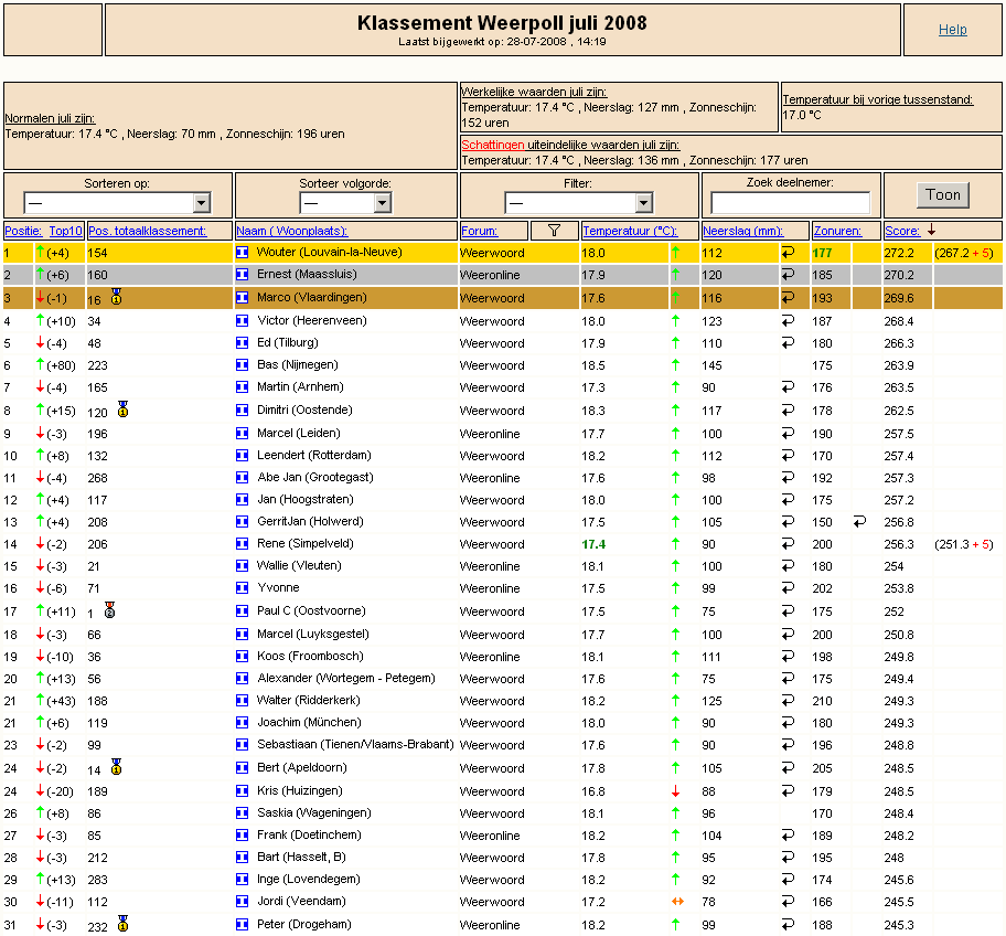Het gaat hard momenteel. Niet alleen wordt menigeen getrakteerd op heftige buien en flinke klappers, maar ook in het klassement lijkt het wel een veldslag inmiddels. Door zo'n 30 millimeter aan neerslag die er is bijgevallen de afgelopen dagen (ongevalideerde cijfers momenteel) en zo'n 8 zonuren van gister (ook dit is ongevalideerd) is het klassement flink door elkaar gehusseld en zien we mensen stijgen met de snelheid van het licht of zinken als een baksteen. Momenteel zien de klassementen er alsvolgt uit: