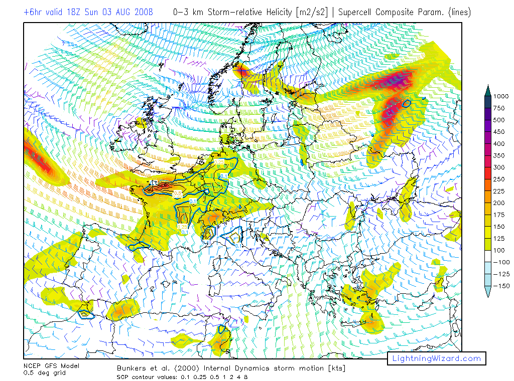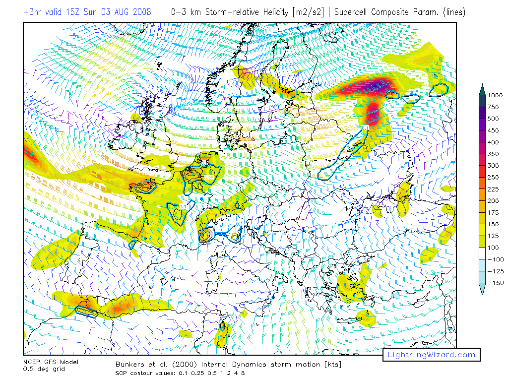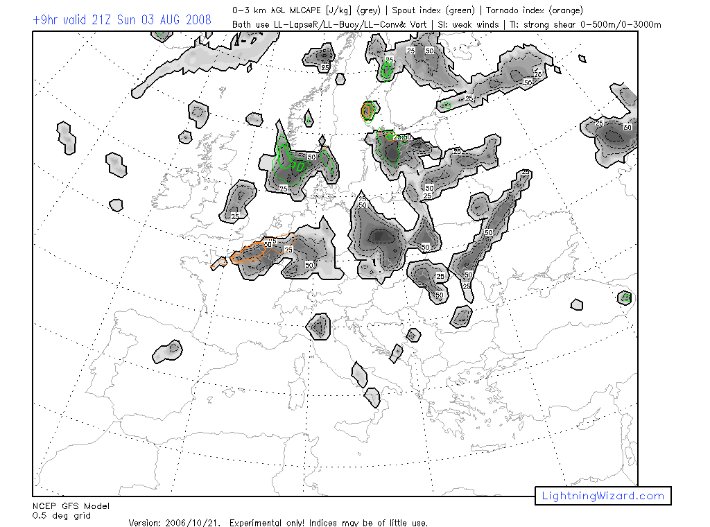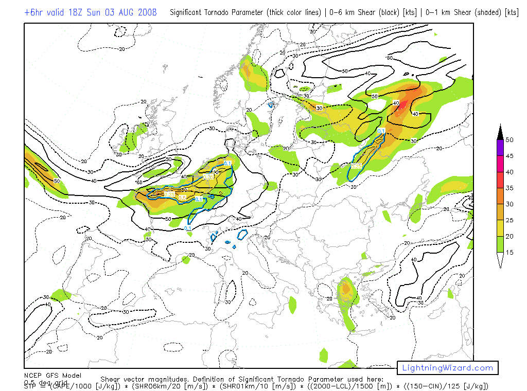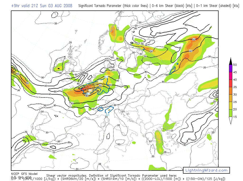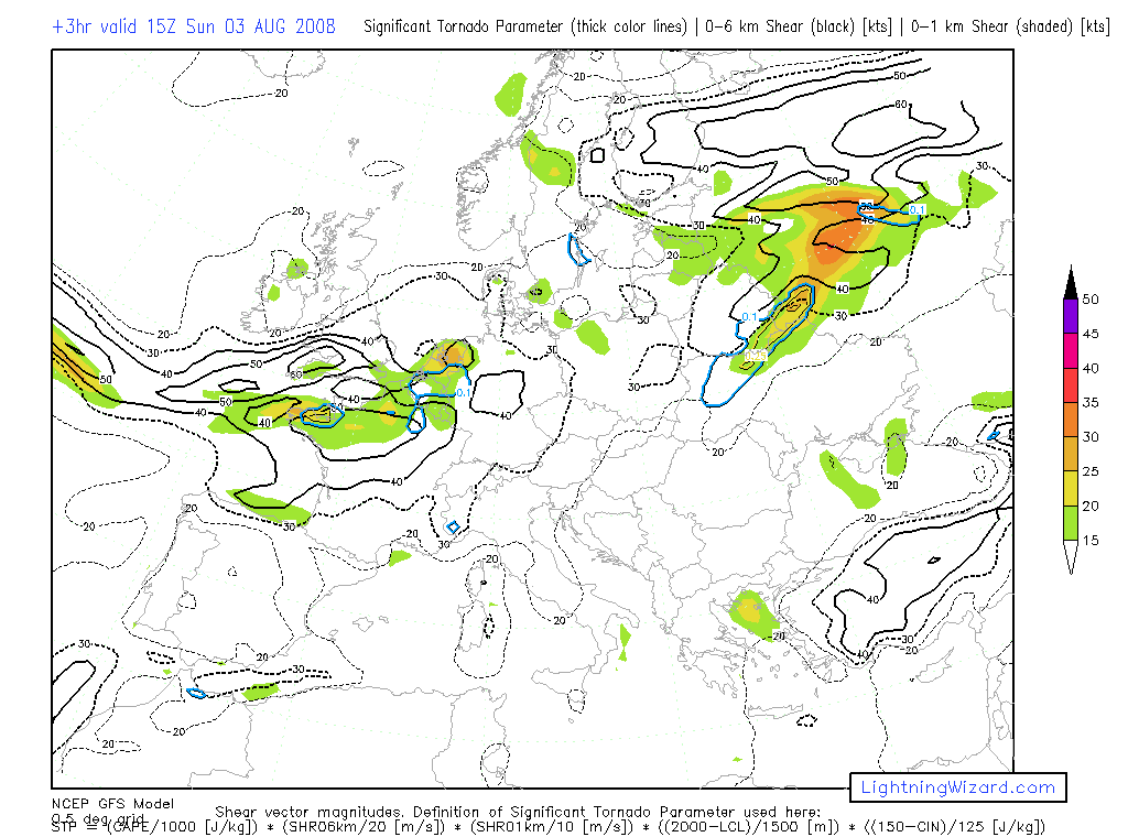Ik denk dat het zinvol zou zijn om ook naar de STP en de SCP te kijken met een vaste CAPE en CIN (bv. 1000 en 10 J/kg), zodat je kunt zien waar zich tóch kortstondige mesocyclonen (of zelfs echte supercells) kunnen vormen bij niet uitslaande SCP/STP. Dit kan bv. gebeuren als GFS de CAPE onderschat.