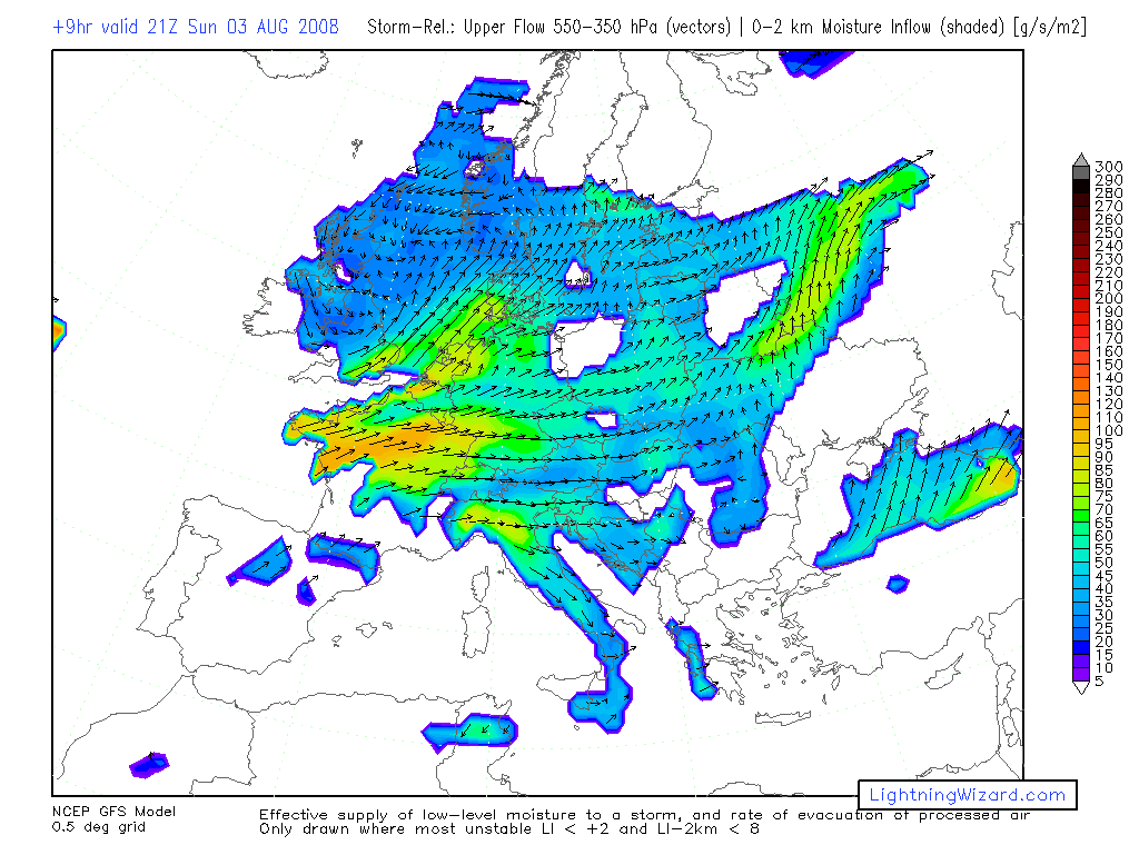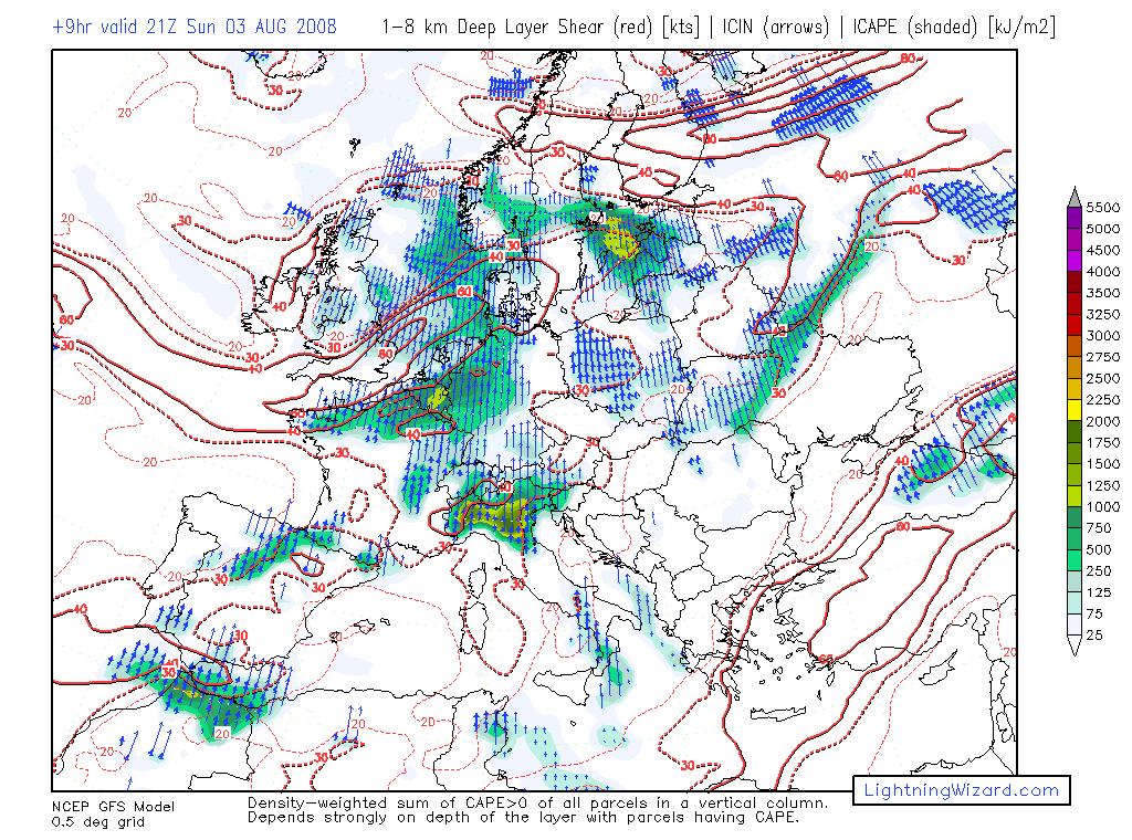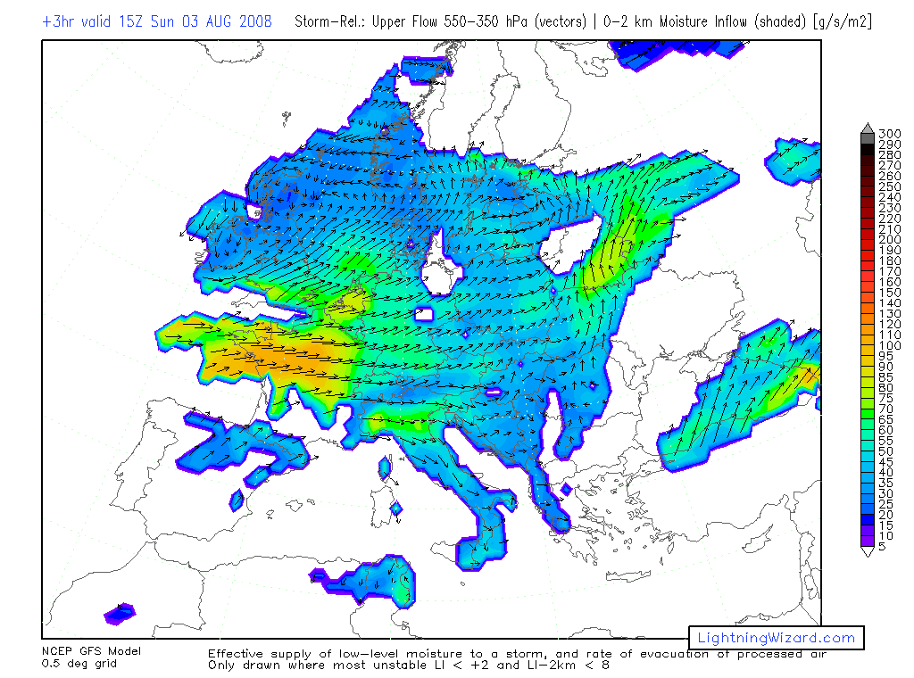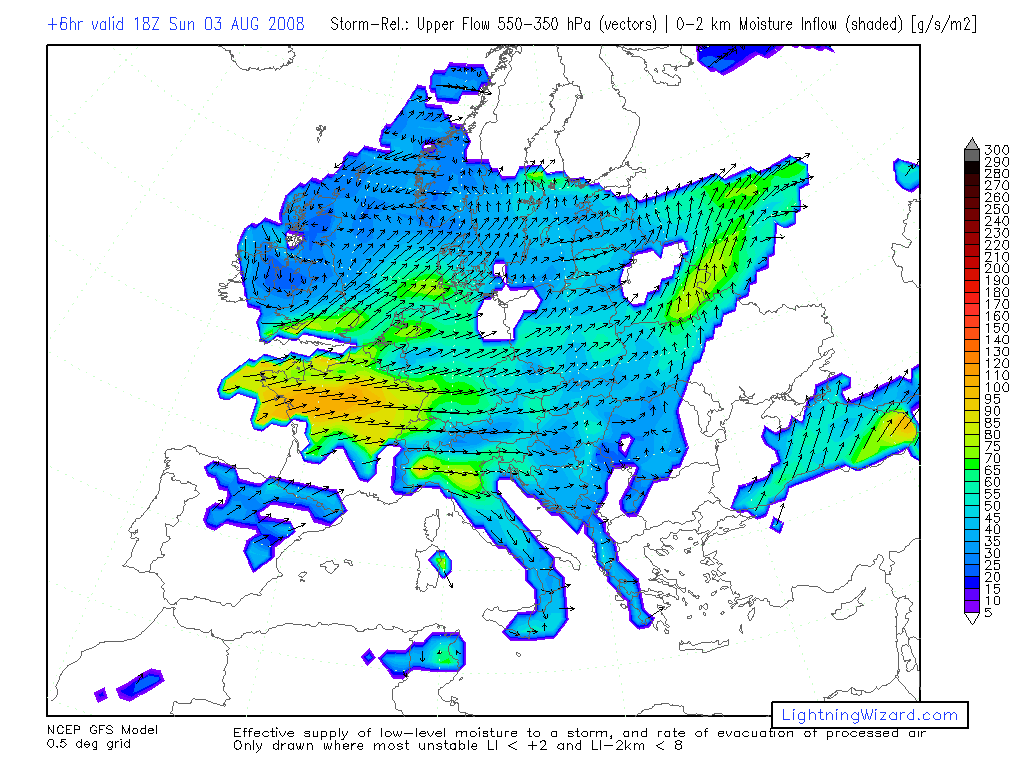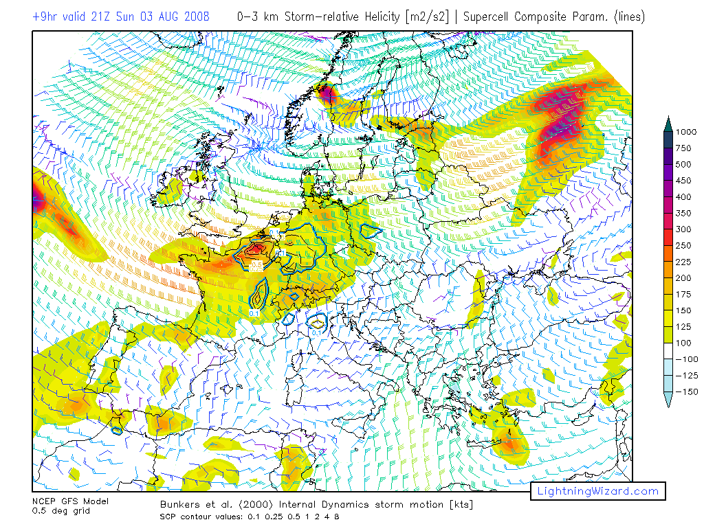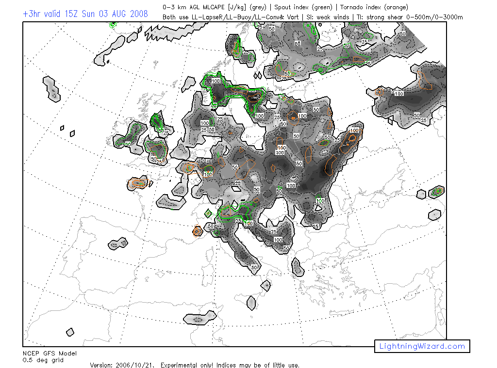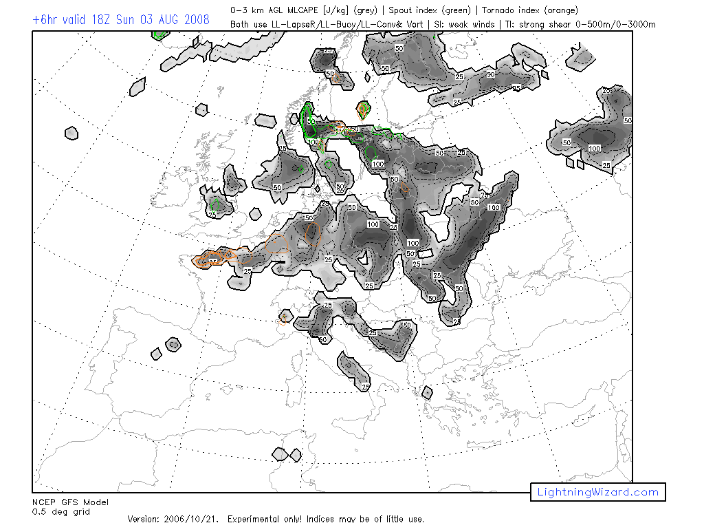 Ik denk dat het zinvol zou zijn om ook naar de STP en de SCP te kijken met een vaste CAPE en CIN (bv. 1000 en 10 J/kg), zodat je kunt zien waar zich tóch kortstondige mesocyclonen (of zelfs echte supercells) kunnen vormen bij niet uitslaande SCP/STP. Dit kan bv. gebeuren als GFS de CAPE onderschat.