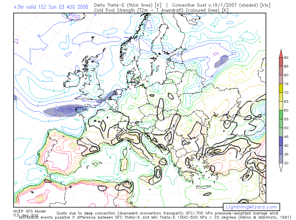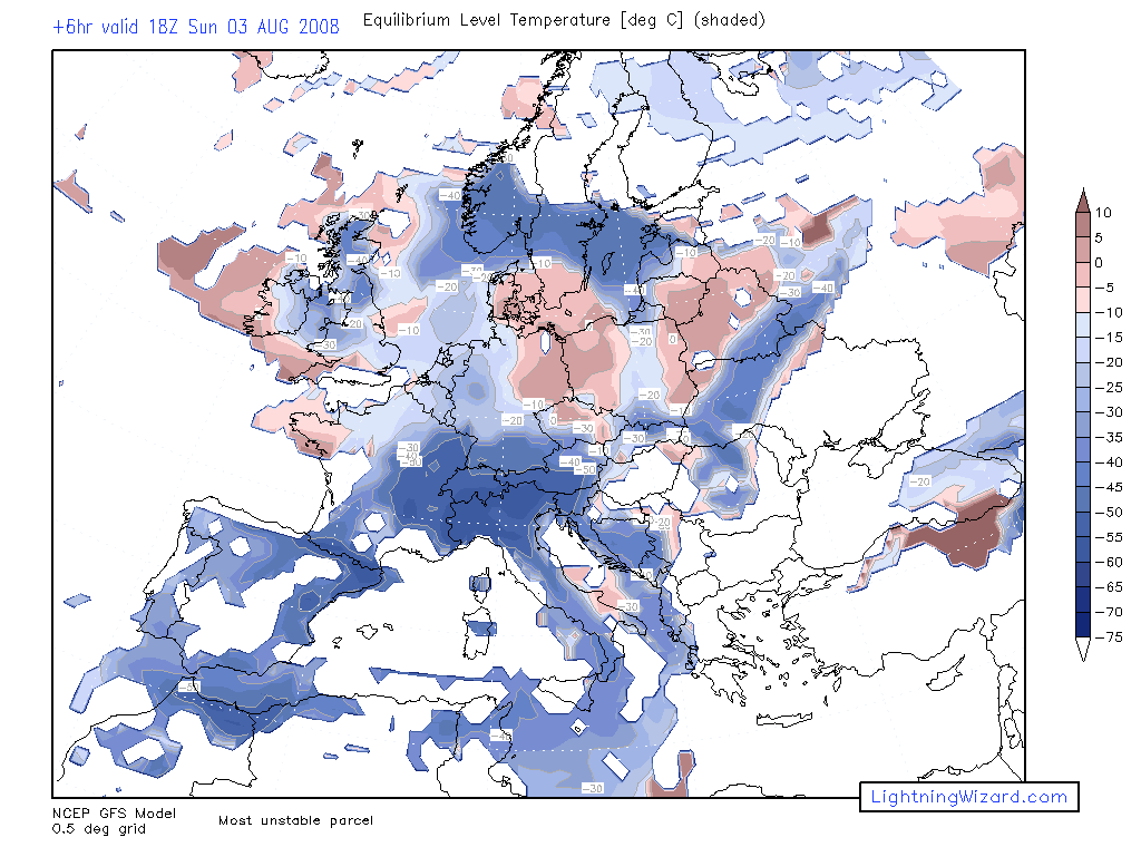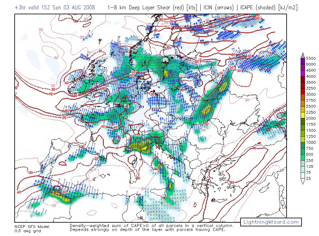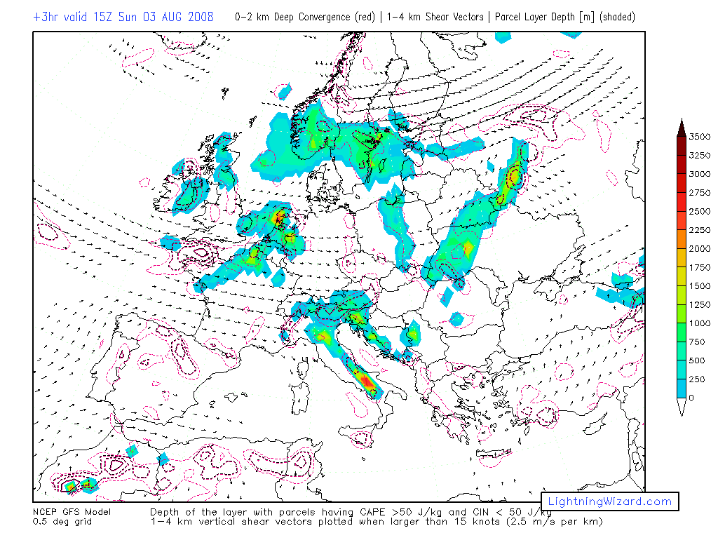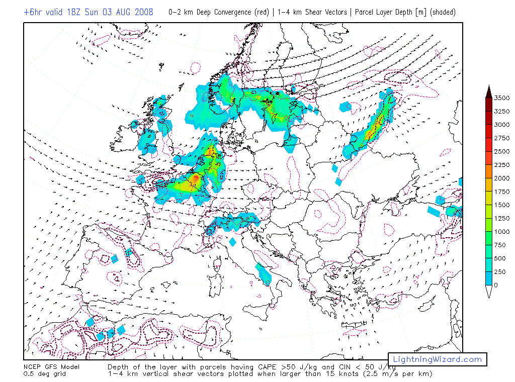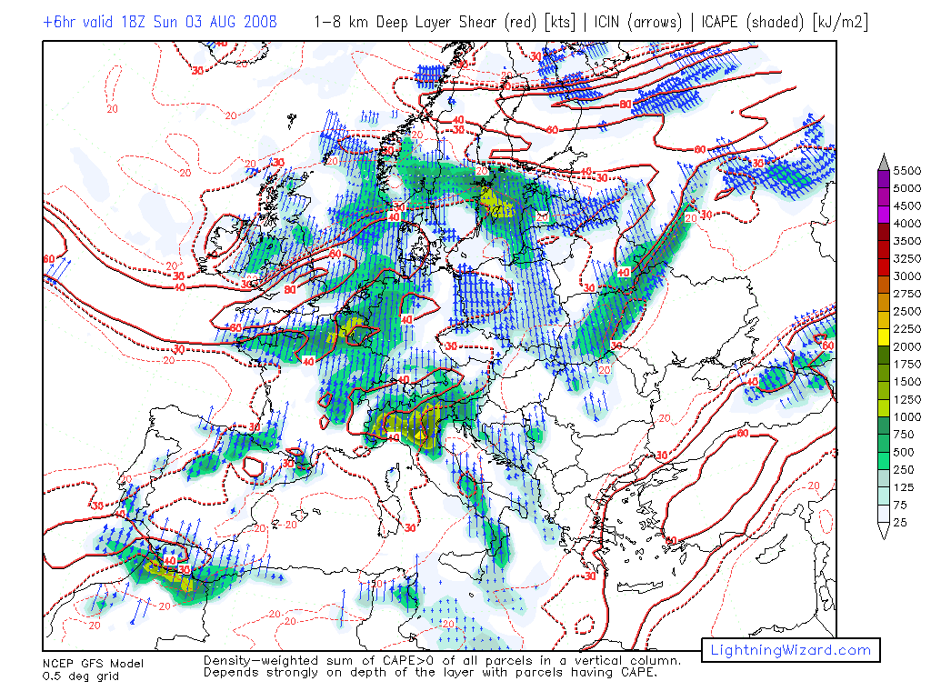 Ik denk dat het zinvol zou zijn om ook naar de STP en de SCP te kijken met een vaste CAPE en CIN (bv. 1000 en 10 J/kg), zodat je kunt zien waar zich tóch kortstondige mesocyclonen (of zelfs echte supercells) kunnen vormen bij niet uitslaande SCP/STP. Dit kan bv. gebeuren als GFS de CAPE onderschat.