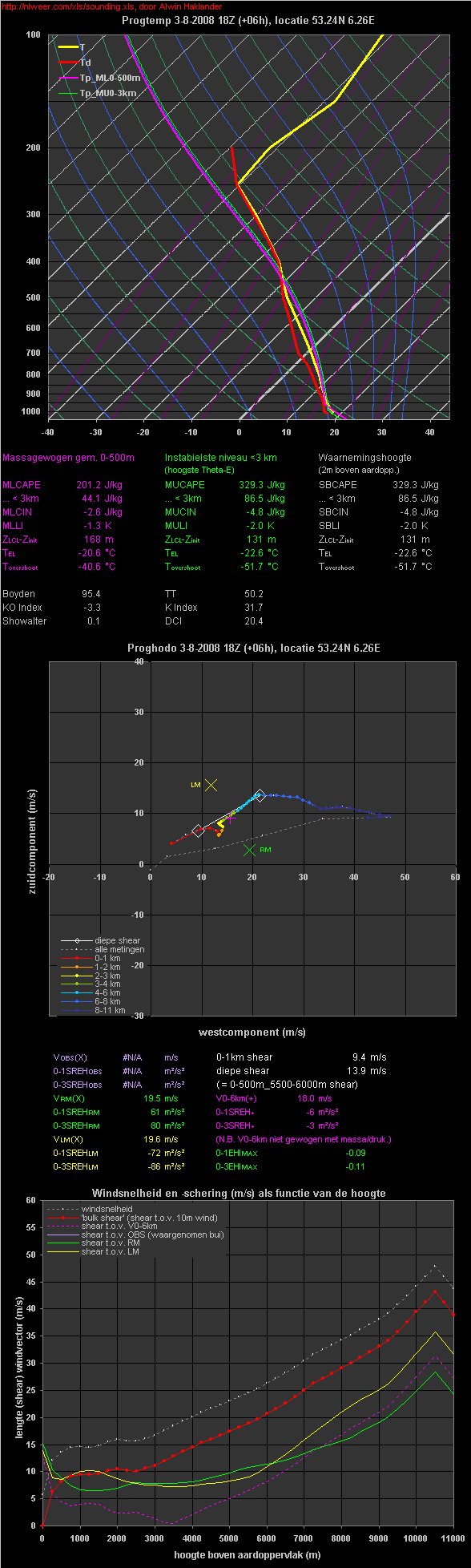 Op basis van de GFS12Z run heb ik even 3 progtemps (+ hodogrammen!) gemaakt. Eerst de 17u en 20u progtemps voor het Groningse Lutjegast (53.24N, 6.26E) en dan de 17u progtemp voor het Friese Sneek (53.03N, 5.67E). Ik heb Sneek gekozen omdat de bui die de tornado produceerde rond 17u stroomopwaarts van Sneek ontstond.