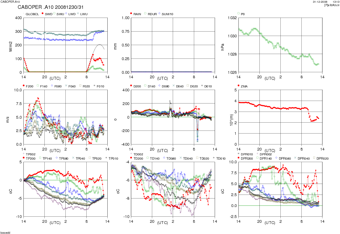 Het effect van de mist/stratus is goed te zien in de stralingsgrafiekjes. De SWD en SWU nemen sterk af, de LWD neemt juist toe. Er vindt nog steeds wel uitstraling plaats (LWU), alleen deze straling wordt bijna volledig weer gereflecteerd door mist/wolken (LWD). Opvallend is dat de temperatuur op 200m hoogte zojuist ook weer flink is gedaald. Het lijkt alsof de luchtlagen weer gekoppeld worden, net zoals gistermiddag het geval was door thermiek. Echter indien dit het geval is, dan zou menging van lucht plaatsvinden en zouden de temperaturen in de lagere luchtlagen plots moeten stijgen. Er lijkt iets anders aan de hand. Een mogelijk verklaring zou kunnen zijn dat doordat het in het westen van het land en boven zee 's nachts veel minder sterk afkoelt, de inversie hier minder ver heeft kunnen dalen. Deze lucht wordt nu geadvecteerd over Cabauw.