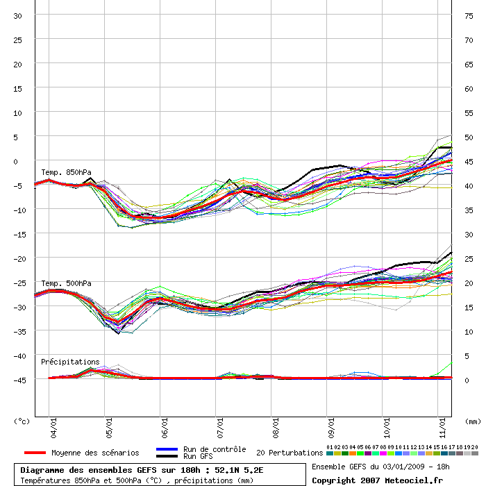 Tussen 5 en 7 januari een zeer koude bovenlucht, daarna een geleidelijke opwarmin tot rond -5 en tegen het eind rond 0 graden op 850 hPa. Opvallen trouwens dat de spreiding in het ensemble zo gering is. Verder weinig neerslag te bespeuren.