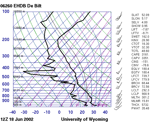 Lifted index rond -8, CAPE meer dan 3000 J/kg en 25 m/s DLS.