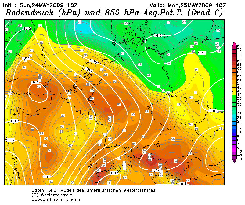 In de namiddag dan waarschijnlijk vorming van hevigere buien boven NW- en N-Frankrijk plus ZW-België, die de neiging hebben om de Noordzee op te trekken. Opglijding van de warme landlucht (op geringe hoogte) over de koele maritieme grenslaag kan voor extra forcering zorgen met die OZO-stroming. Later op de avond en in de nacht maakt W-, later ook NW-Nederland kans op zware onweersbuien.